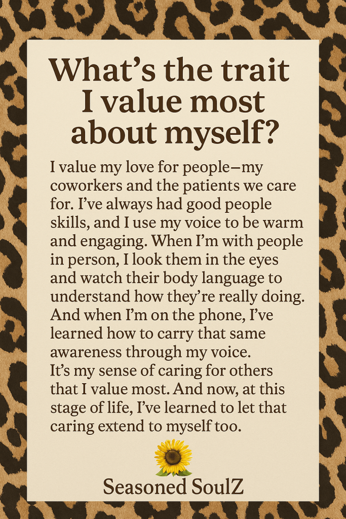 It’s my sense of caring for others that I value most. And now, at this stage of life, I’ve learned to let that caring extend to myself too. 🌻