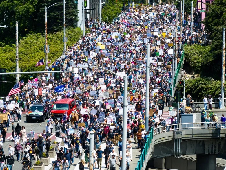 The march stretched more than a mile long. The Seattle Police Department estimated nearly 90,000 people took part — families, students, elders, artists, neighbors — all walking shoulder to shoulder.