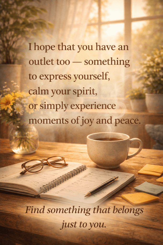 My hope is that you have an outlet too — whether it’s writing, art, music, movement, or quiet reflection — something that helps you express yourself, calm your spirit, or simply experience moments of joy and peace.