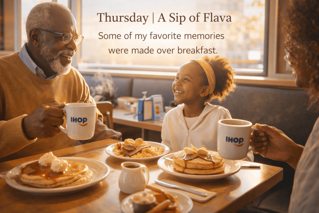 I’m sitting with my coffee this morning, drifting back to breakfast outings at IHOP with my Daddy and my grandbaby. To this day, it’s still her favorite spot.