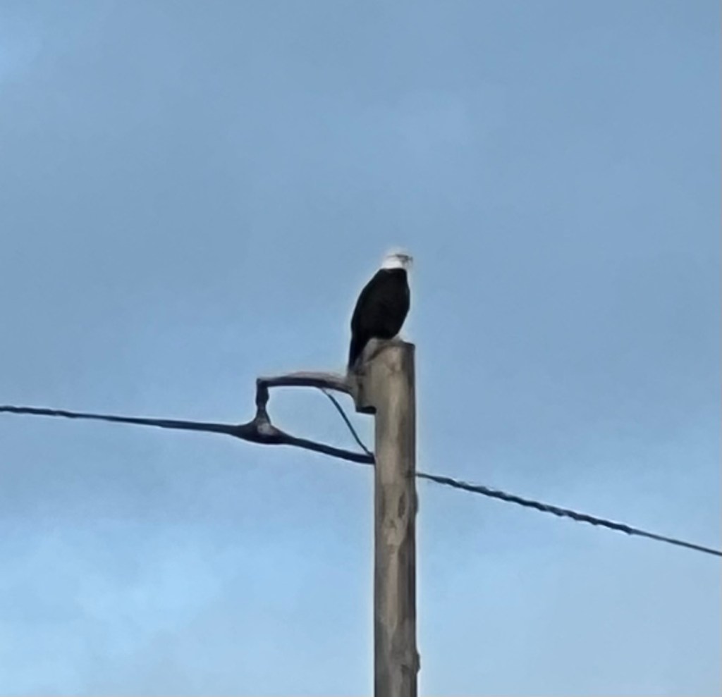 👉 a bald eagle landed on the pole.